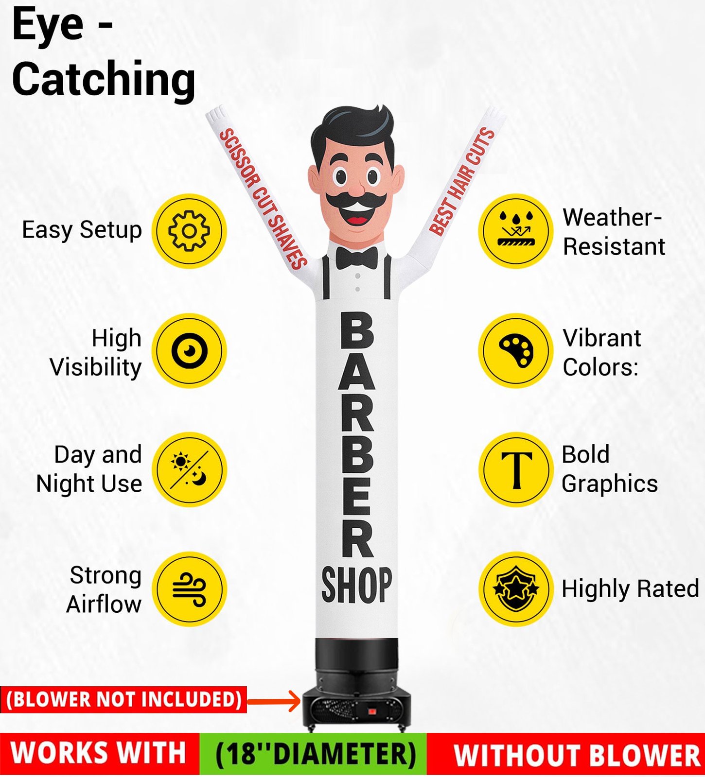 Stands 10ft tall for high visibility, but compact enough for sidewalks, medians, parking lots, and pop-up barber events. - Unmissable Motion & Messaging: