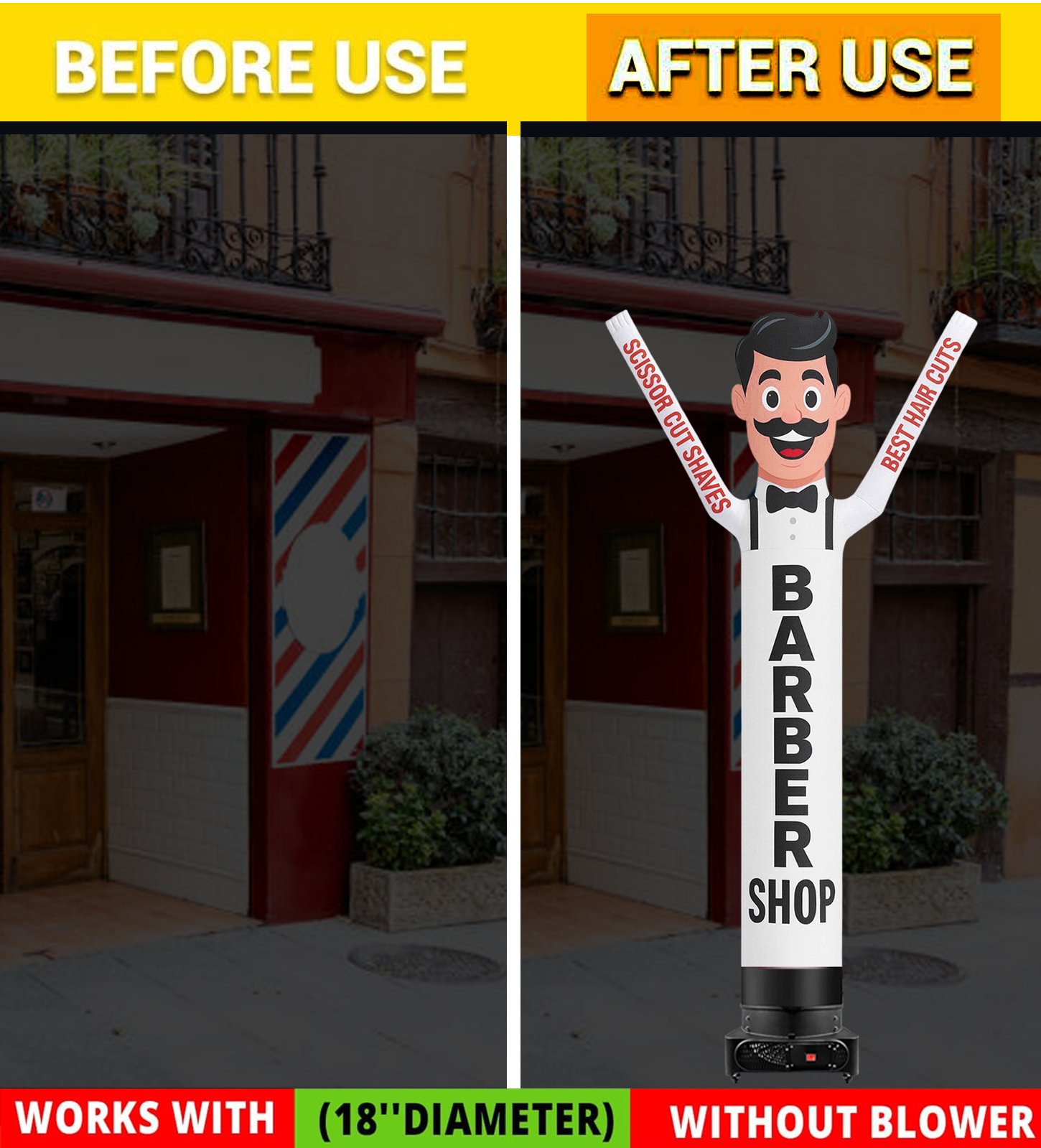 If you want your barbershop to stand out on crowded streets or at community events, outdoor inflatable advertising is your shortcut to unbeatable visibility. The 10ft Barber Shop Waving Men is the perfect blend of playful animation and classic barber branding. Whether you’re in New York, Texas, Florida, California, or any top USA state—this wacky waving tube man draws more eyes, more foot traffic, and more customers.