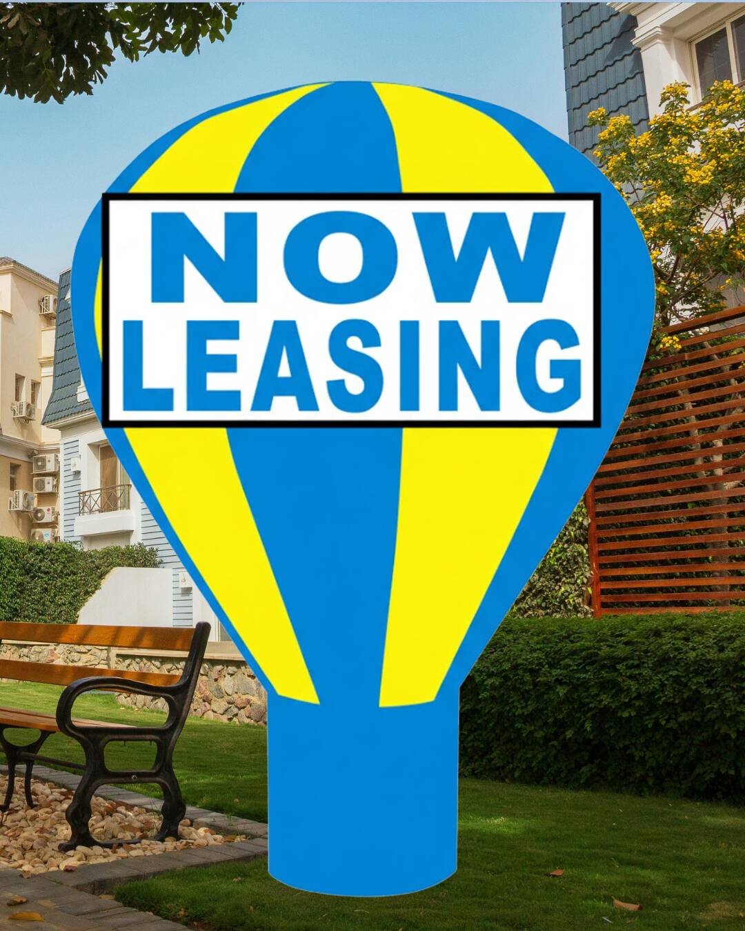 🎨 Color: Blue and yellow “NOW LEASING” graphics